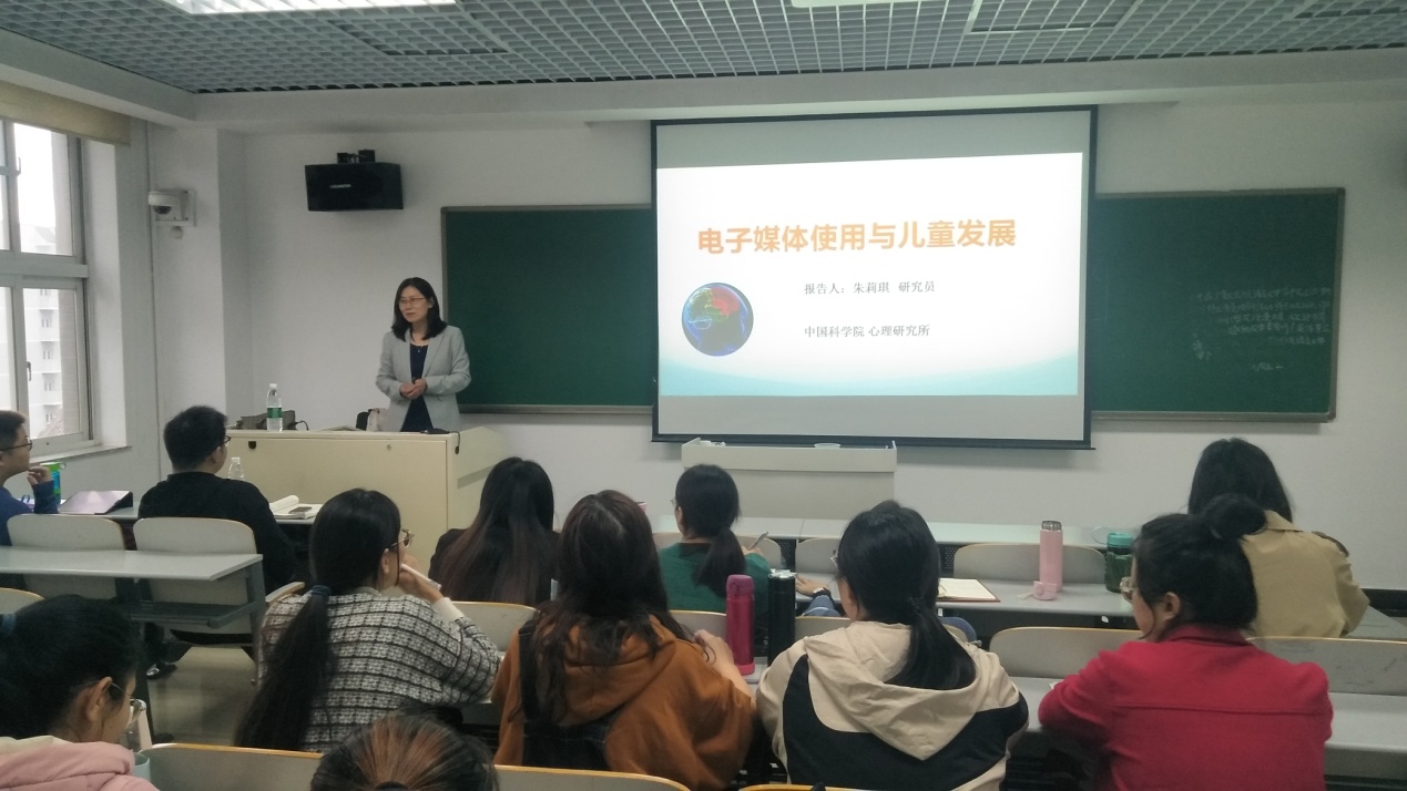 朱莉琪研究员以怎样做好一个研究为切入点,循序渐进地向同学们说明了如何一步一步的完善一个研究。首先是进行选题,我们要先列举出要研究的内容,以及我们为什么要研究这个内容和它的现实意义。例如电子媒体,它无处不在,而且给我们的工作生活和学习带来了巨大的便利,同时也给家长带来担忧。紧接着就要提供证据,例如儿童使用电子媒体的情况,其中包含很多不同的数据,比如员工个人专属手机拥有率、学龄前儿童拥有Ipad的比例等。那么使用电子产品到底会对儿童发展产生什么影响呢?也就是做研究要从一个广泛的概念聚焦到一个点。我们就要先分析婴幼儿发展特点,以及分析电子媒体使用对儿童发展的影响的相关理论,这其中就包括媒体效果的理论,涵化理论,代替理论,使用-满足理论,社会认知理论,发展的生态系统理论,生态科技系统理论等。朱莉琪研究员还提到,新的文化工具对儿童思维发展影响的三条路径包括:使用时间,媒体的形式和媒体内容。紧接着讲到电视与认知发展,朱莉琪研究员向我们解释了时间因素中的视频缺陷效应,现实节目和超现实节目,让我们讨论了关于个体差异中为什么家境较好的儿童,看电视的时间越长,其学习成绩越差,而家境较差或者言语水平不流利的儿童则会出现相反的现象。接着讲到视频游戏与认知发展的好处与不利,以及电脑使用与儿童发展,电子媒体对儿童社会行为的有利和不利影响。最后,朱莉琪研究员向我们展示了关于中国科公司心理研究所研究的关于发展心理学的一些研究问题与方向。