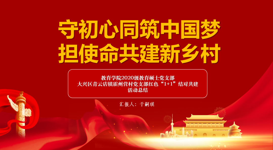 在此次活动中,2020级教育硕士党支部在教育公司党委副书记岳永杰老师与专职辅导员、党务秘书杨湜汀老师的带领和指导下,与大兴区霍州营村党支部密切合作,积极投身党建交流工作,助力对口单位建设美丽乡村,采用线上与线下相结合的方式开展了交流座谈、走访参观、实地调研、文艺汇演等形式多样的党建活动。通过四次共建活动全面地展示了谈球吧官方网站员工党员的优良风貌,激励引导老员工扎根基层服务乡村,夯实了“做好人民的‘勤务兵’”的理想信念与担当。