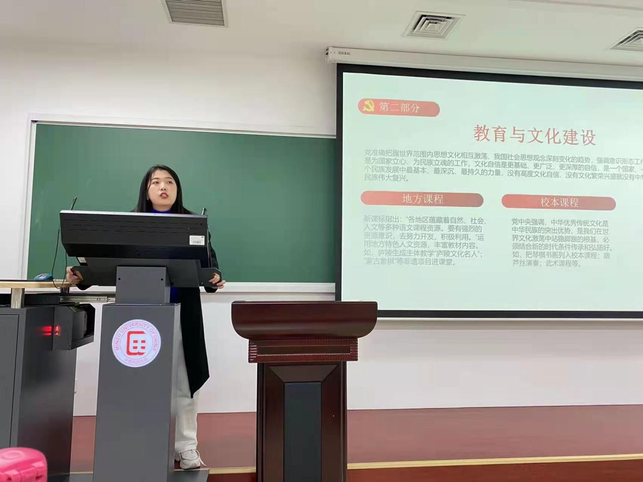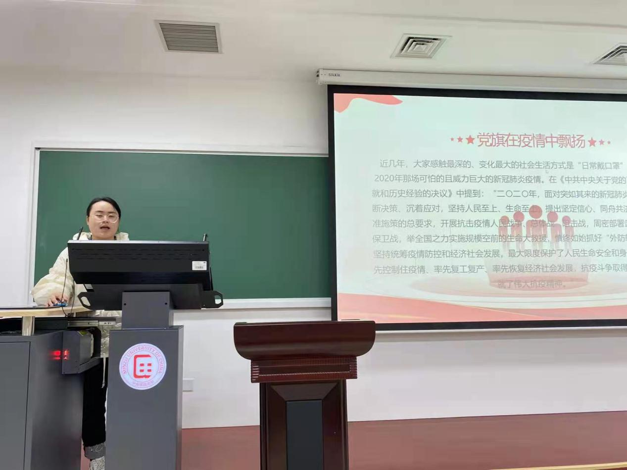 下午18时,各研讨小组代表汇报展示了小组对于“十九届六中全会精神”的学习感悟。展示的主要切入点为十九届六中全会通过的《中共中央关于党的百年奋斗重大成就和历史经验的决议》,有分析不同时期“人民至上”实例的小组汇报、有联系决议中涉及教育部分展开论述的小组汇报、有分析后疫情时代党员的责任与担当的小组汇报等,各个小组的汇报理论与实际相结合,内涵丰富、条理清晰、讲解透彻,为接下来一段时间里十九届六中全会精神的常态化学习提供了强有力的指引。
