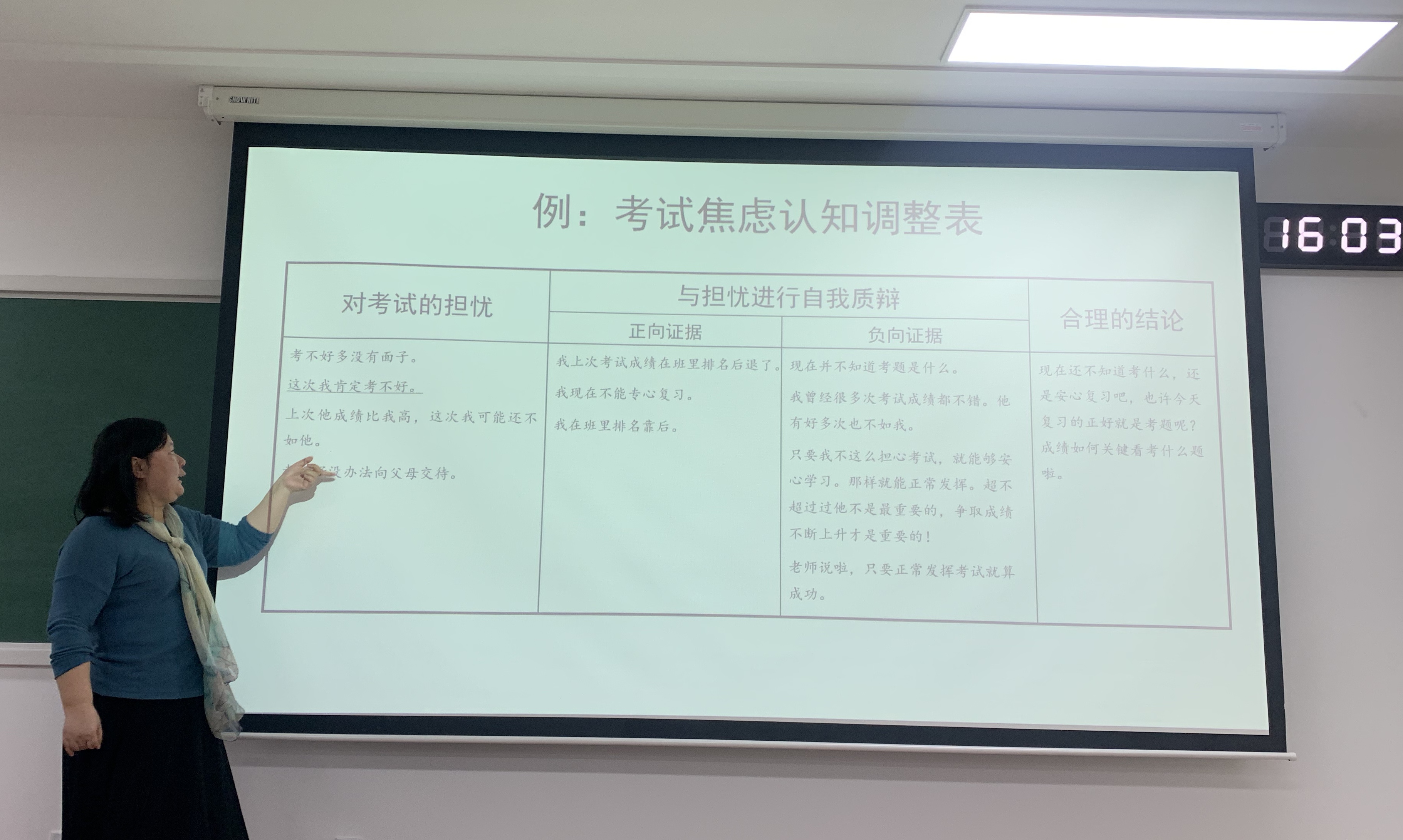 随后,陆老师从“考试是紧张好还是不紧张好?”这个问题出发,从心理学研究的角度给同学们介绍了考试动机和考试成绩的关系,为大家明确“动机(焦虑)水平与考试成绩成倒U型曲线,还受任务难度影响。”并且陆老师为大家介绍了我们可以利用“青少年考试焦虑自测表”来测评自己的焦虑程度,强调我们需要关注“太焦虑和太镇定”这两类极端值人群。