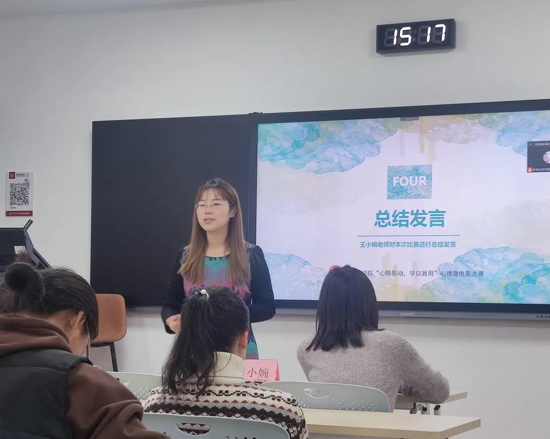 颁奖环节结束后,王小婉老师对本次活动进行了总结发言。王老师对各位选手的心理微电影作品表达了高度的肯定和赞扬,并分别点评了每个微电影触动人心的部分。王老师表示,每一个作品背后都体现了同学们积极向上、向善、向好的成长态度和价值追求和对亲情、友情、爱情以及对原生家庭的思考,祝愿同学们能够用心地去面对生活、面对自我,用心地去关爱他人,积极成长,拥有美好的未来。