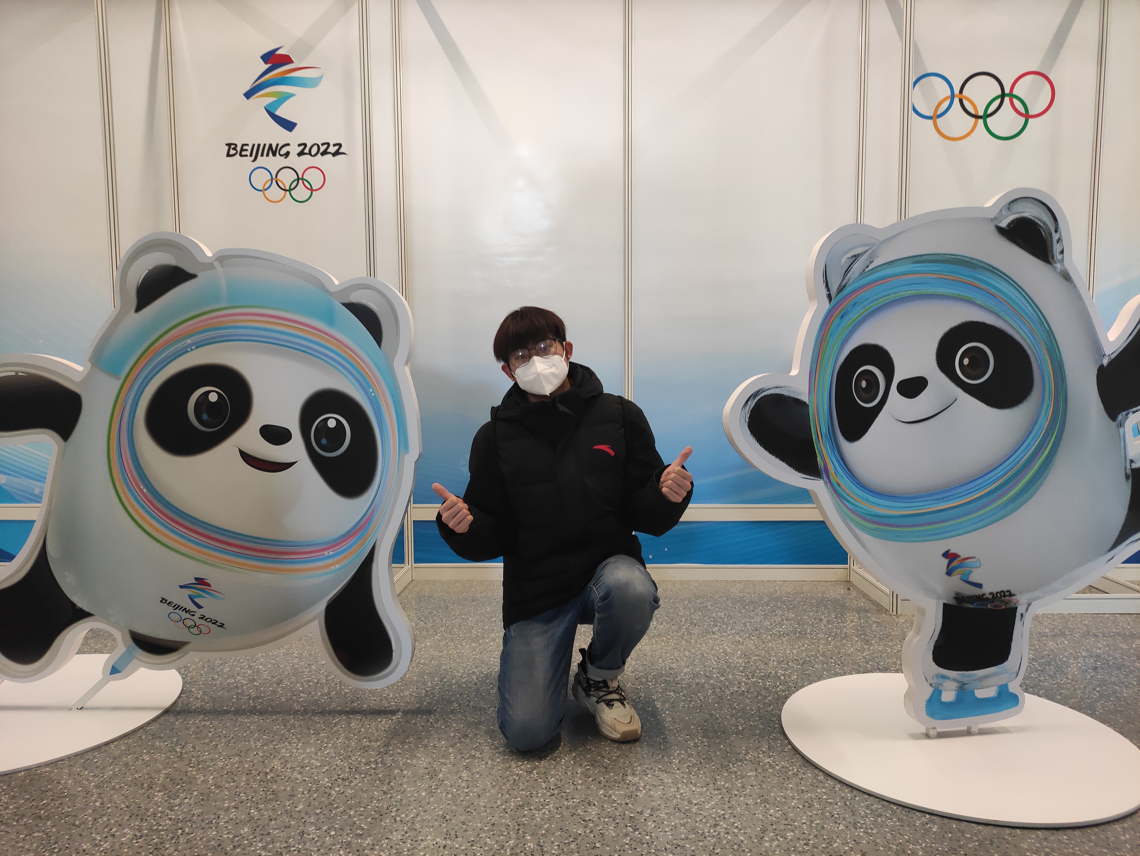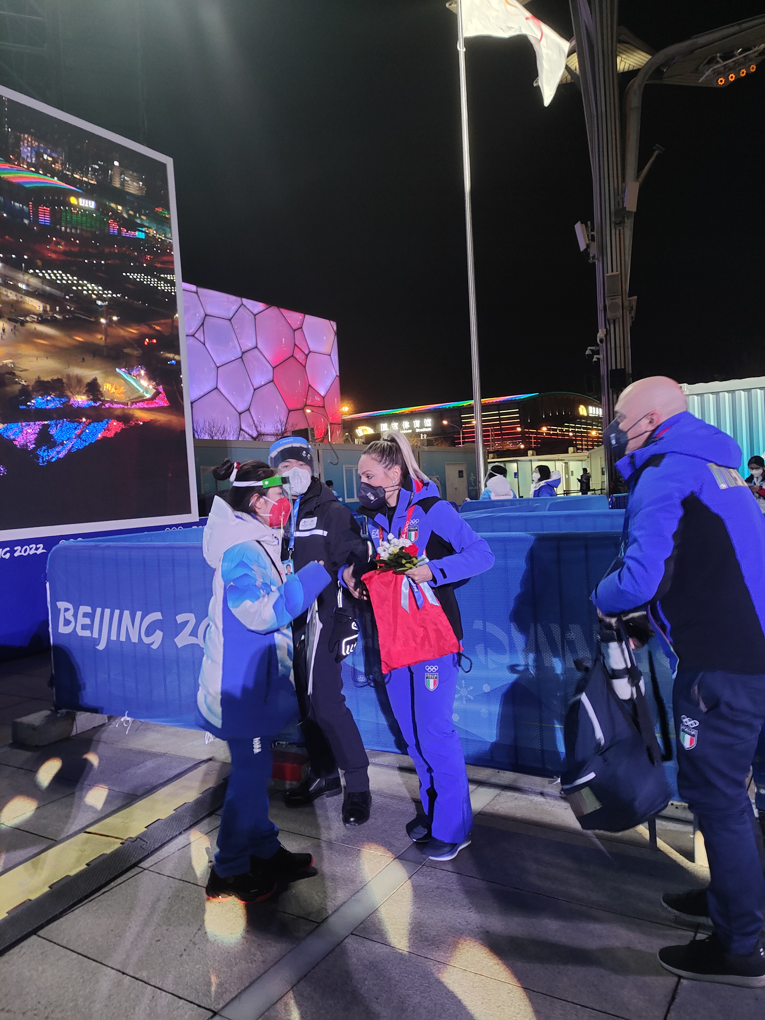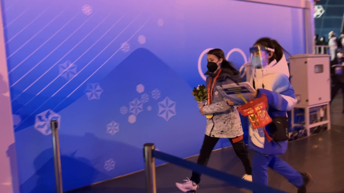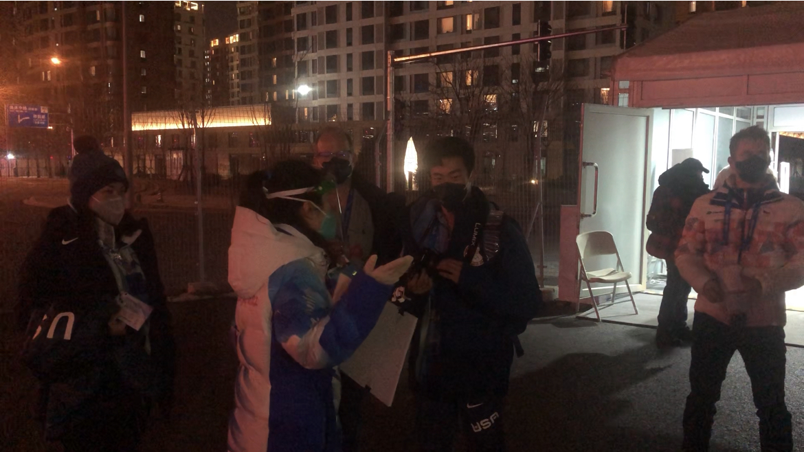 在一开始,我得知要去接他的时候,心情很复杂,他的花滑团体赛队友于颁奖前一天确诊,但由于国际上密切接触者的认定规则与我们国内并不相同,所以Nathan还是要正常参加当天花滑男单金牌的颁奖仪式。而且网上对他的评价其实并不是很正向,以至于我对他也产生了一点抵触的情绪。在出发之前我还是努力调整了一下:不管怎样,既然我要去接他,那我就是在代表中国奥组委去接他,必须像对待其他运动员一样热情,一举一动都不能有任何差错。到了冬奥村时令我很意外,美国队前前后后出来了大概四十多位队友去坐前往颁奖广场的运动员班车专门为他庆祝。后来才知道,原来Nathan一开始和我说了中文(对、好的、是),但是我戴着面屏没有听得很清楚。而且和他接触过那一面后,我对他的印象有了改观,他在和我接触的时候,是非常的平易近人、可爱、帅气的,他的队友们对我也很和善。当时很庆幸,有一名我们领域的老师也在冬奥村,为我记录下了这珍贵的时刻。
