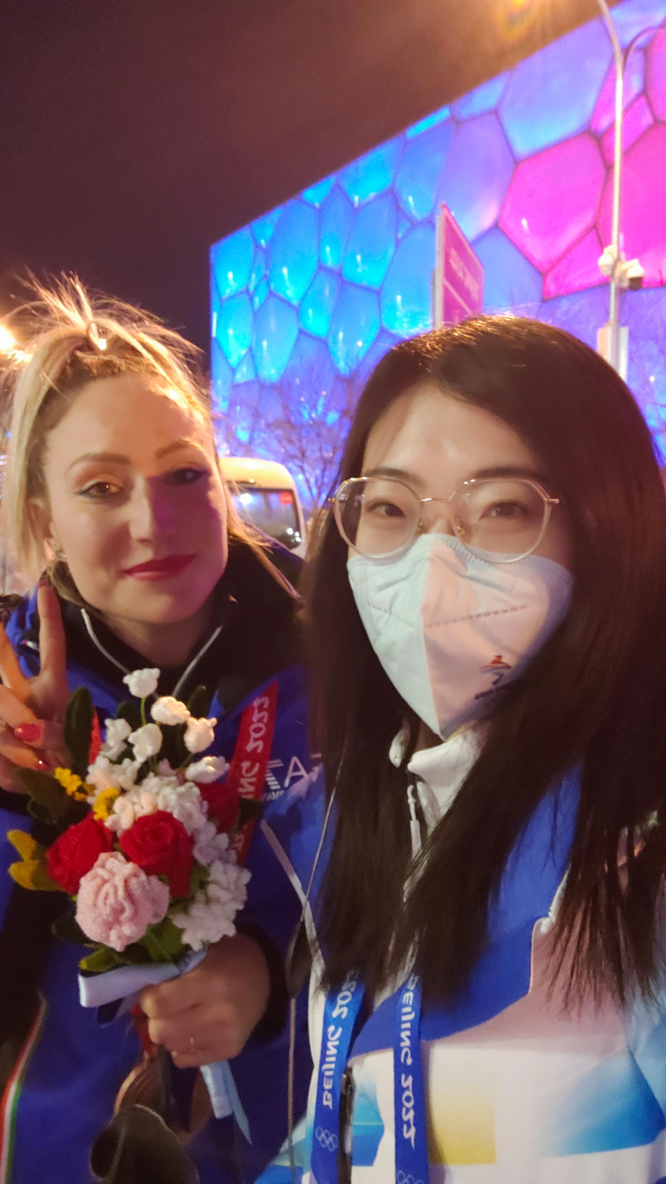 没有陪同任务时,我们便作为秩序维护志愿者迎接各国运动员。在这里,我们见证国旗升起,国歌奏响,和中国健儿共庆荣耀。我看过他们脸上动人的微笑和眼中深情的泪水,那是对祖国无声的告白。我听过观众区传来的“中国队,加油!”的声声呐喊,那是对祖国的运动员最热烈的祝福。每一个瞬间都让我觉得,身为中国人,是一生的骄傲。在这里,我看到运动员们是对手亦是朋友的惺惺相惜。2月14日晚速度滑冰女子500米的颁奖仪式上,黑白黄三种肤色的运动员同登领奖台。合影时,她们靠得很近,愉快地相互祝贺,我被这一幕深深触动。这里是一个小小的乌托邦,这里的每个人都毫不吝啬向身边人表达爱意,无关乎性别、肤色或是国籍。在这里,我看到我们作为人,彼此是多么的相爱。