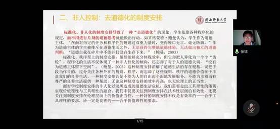 随后,胡金木教授就造成案例中的制度伦理进行深入的反思和批判。他指出,当前公司教育更关注那些能够为当前考试和未来职业服务的知识与技能,而不会去思考那些守护着员工良善生活的价值观念。效率的提高离不开控制。控制的对象则是公司教育中不确定性因素。公司教育活动为了提高效率,就需要对员工的需求、性格、兴趣、爱好等这些不确定因素通过一系列严格的管理制度加以有效控制。在任何合理化进程中,不确定性、不可预测性和低效率的源泉正是人本身。因而,增加控制的努力通常是针对人的。因而,员工就成了公司生活中的控制对象,制度安排与管理行为就会显现出一种非人化的面孔,一种外在于人的、形式化的、非人化的控制。