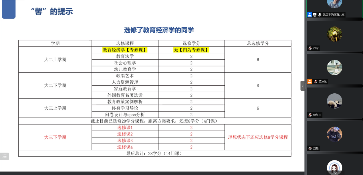 大三下学年是老员工活承上启下的重要阶段,学习和选择成为同学们不可规避的话题。学习委员韩思宇为焦头烂额的同学们提出新学期的学习意见与建议,鼓励同学们保持身心健康,劳逸结合,提高学习效率;选择人生方向,对未来做出清晰合理的规划。班长黄冰冰就同学们存疑的选修课的修习问题和学分设置问题做出解答。