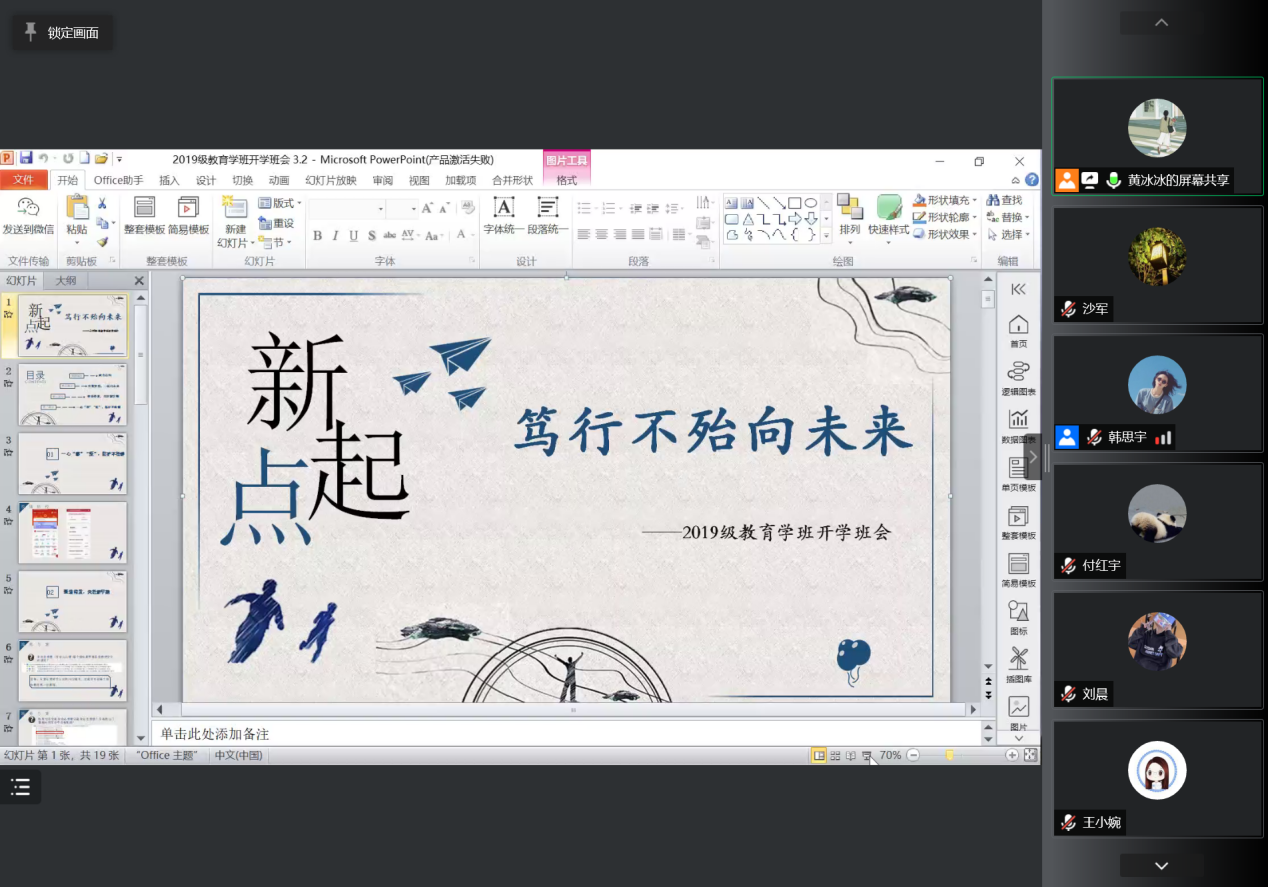 2022年3月2日晚,19级教育学班全体同学于线上开展了本年度首次班会,会议由班长黄冰冰同学主持,班主任周廷勇老师,辅导员王小婉老师莅临本次会议并讲话。