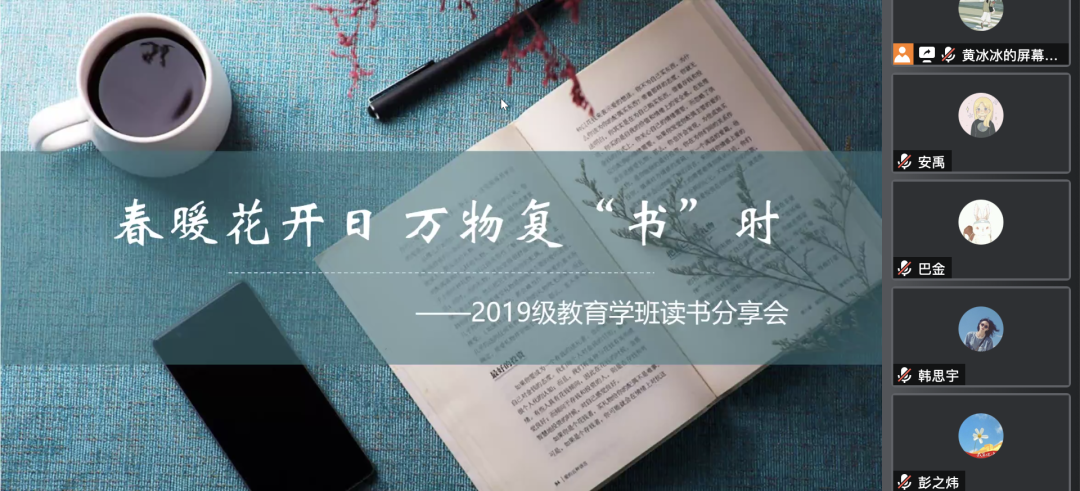 值此第27个世界读书日到来之际,为激发公司员工的读书热情,提高老员工的综合素质,营造积极向上、清新高雅的文化氛围,使公司员工能够“宅”享文化盛宴,有效丰富精神文化生活,2022年4月21日晚19时30分,19级教育学班通过腾讯会议召开春日云端读书会,来自五湖四海的39名同学齐聚云端,倾心交流,以书会友,畅所欲言,共同探讨读书的想法和思考。19级教育学班班主任周廷勇老师和辅导员王小婉老师出席本次读书会,读书会由班长黄冰冰同学主持。