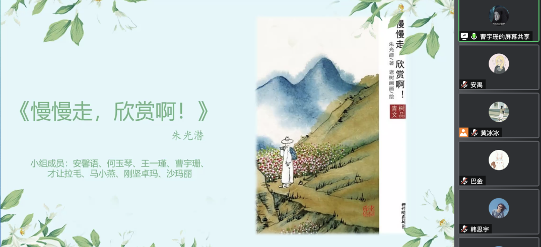 其次,第二组的曹宇珊同学为我们带来的是朱光潜先生的《慢慢走,欣赏啊》这本富有生活色彩的哲思之书。本组的几位同学分别从“处世的智慧”、“谈立志”、“谈读书”、“谈人生与我”、“谈三此主义”、“谈三敬”、“学会欣赏”、“人生的艺术”等角度为我们铺开了人生这幅精彩的画卷。在他们的生动阐述中,我们也深切地感受到了朱光潜先生对于青年人实实在在的关心与教诲、启悟与鼓励。