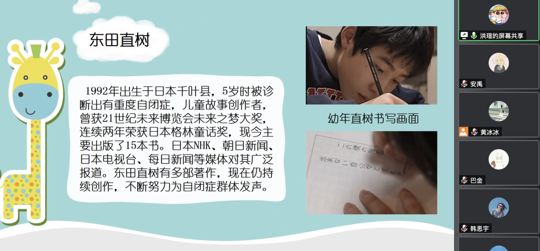 接下来,第三组的洪瑄同学向大家介绍的是日本作者东田直树的《我想飞进天空》。这本书用最朴实的语言,以58个问答的形式向我们解释了自闭症孩子在想什么、他们的痛苦和乐趣,以及他们“奇怪”行为背后所要表达的情感和思绪,向我们呈现了自闭症儿童的小小世界。值得一提的是,这本书的核心内容与我们本学期的特殊教育学这门课密切相关,因此本组的汇报也极大程度上加深了同学们对特殊教育的理解,并为我们提供了进一步思考与探究的空间。