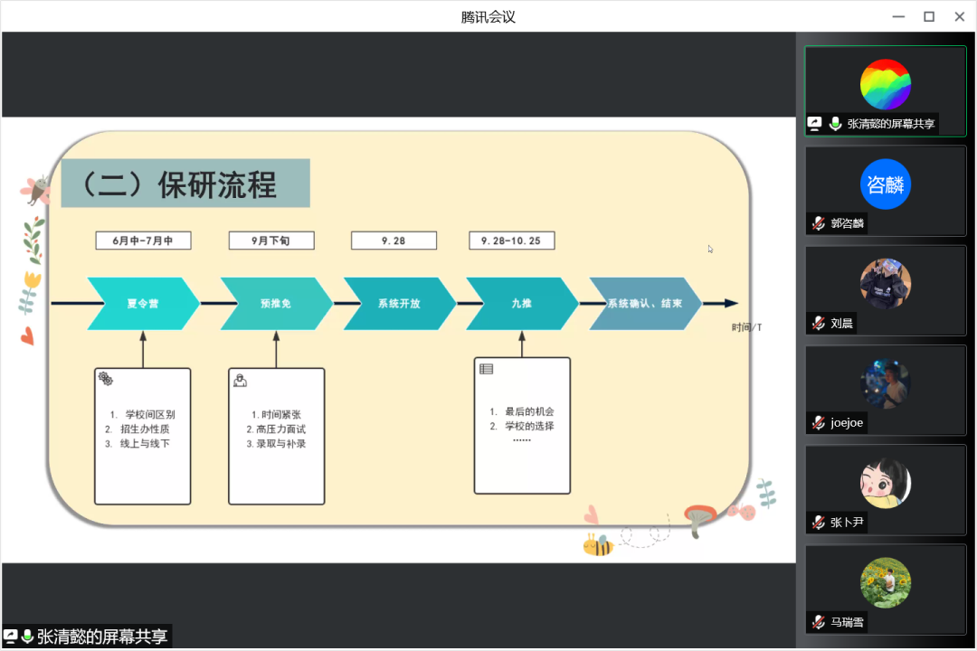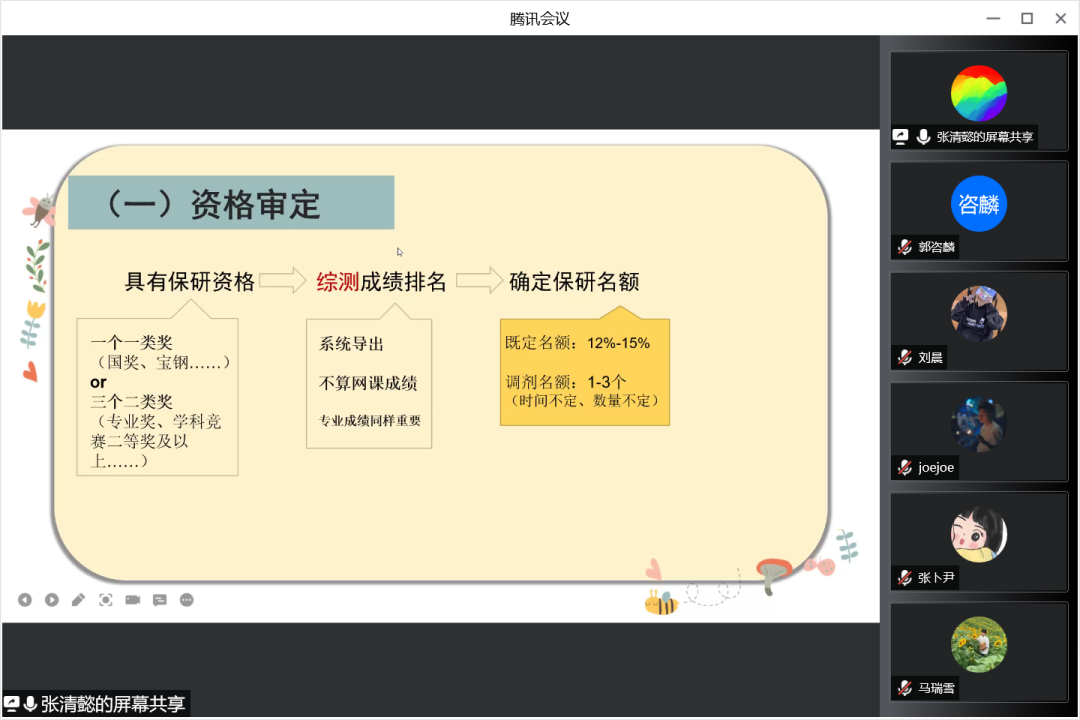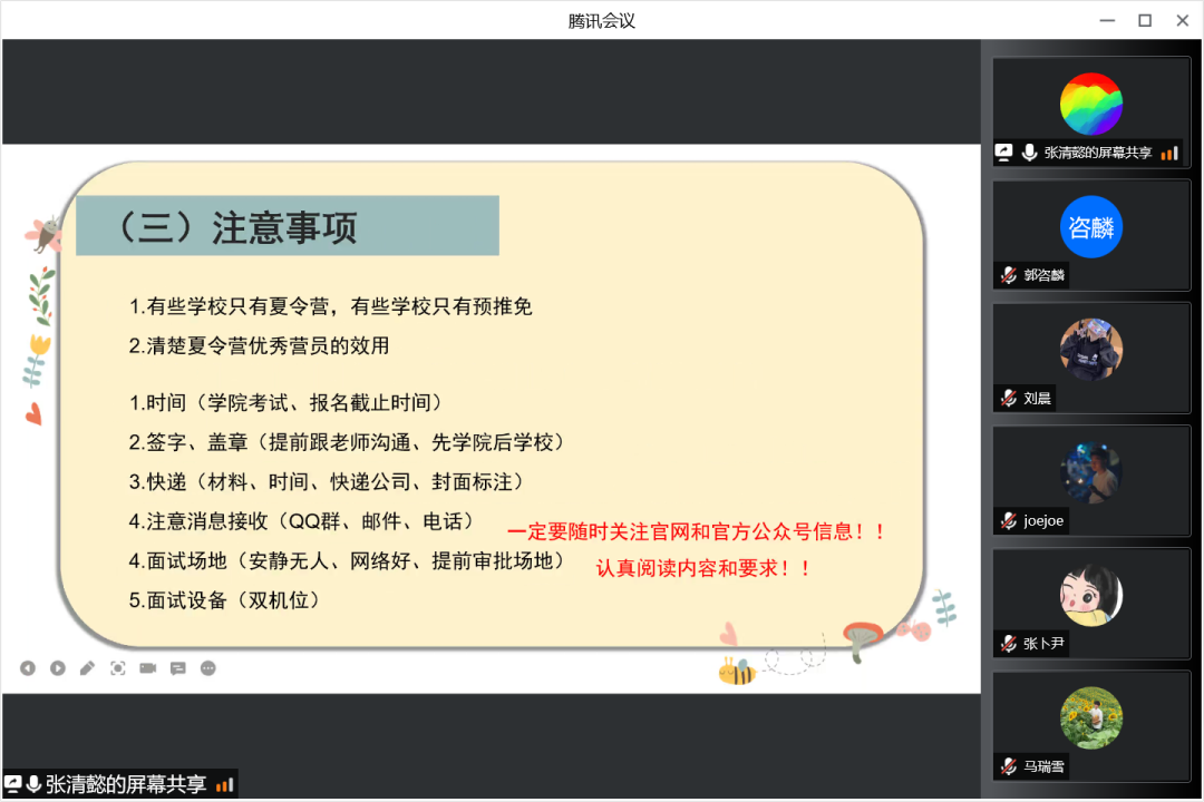 紧接着三位嘉宾从保研资格审定、保研流程、材料准备等方面向同学们详细介绍了保研的前期准备工作。同时也提醒同学们一定要随时关注官网和官方公众号信息,认真阅读内容及要求。要注意各项考试和报名的截止时间,快递邮寄材料的相关要求,邮件电话等信息的接收。在面试前要提前审批好场地,选择安静无人、网络好的场地,要事前做好充分的准备。