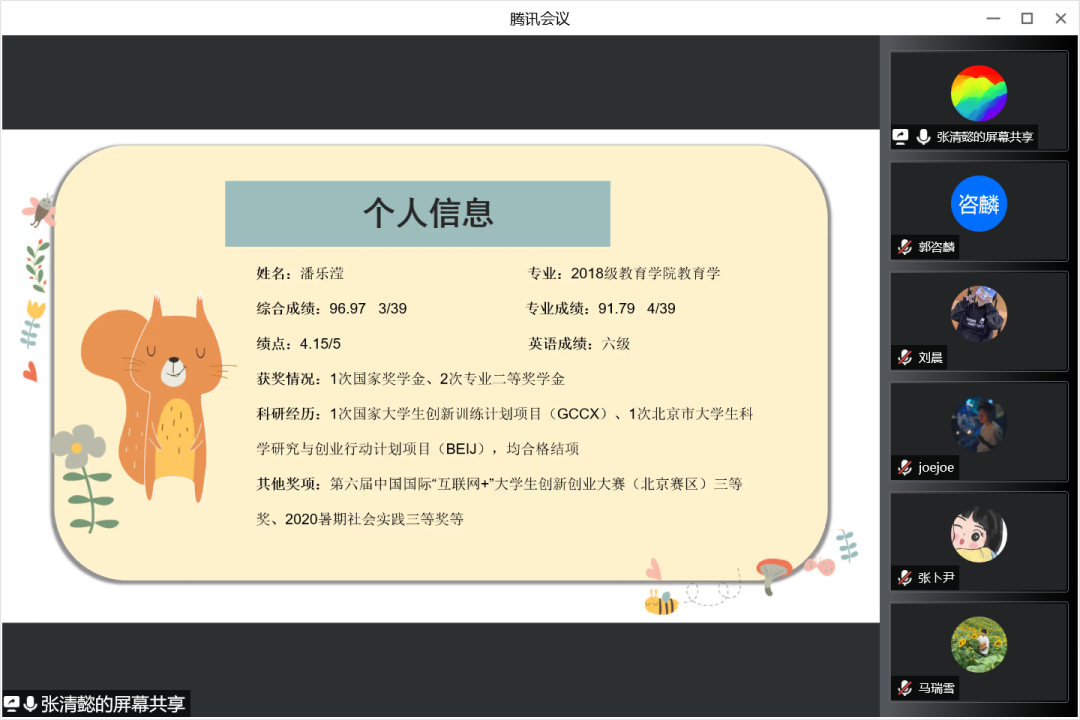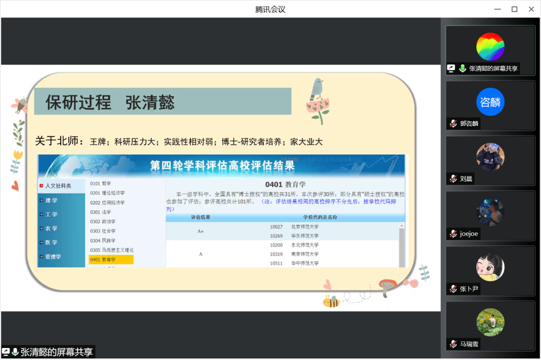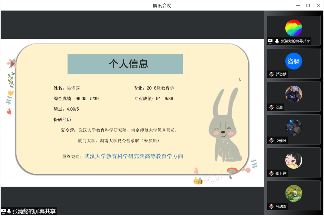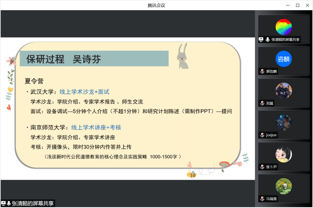 2022年4月22日晚19:00,谈球吧官方网站保研分享交流会以线上腾讯会议的形式召开,谈球吧官方网站团委书记王小婉老师、辅导员杨湜汀老师参与了本次会议。本次会议我们邀请到2018级教育学专业的张清懿、潘乐滢、吴诗芬三位嘉宾分享她们的保研经验。