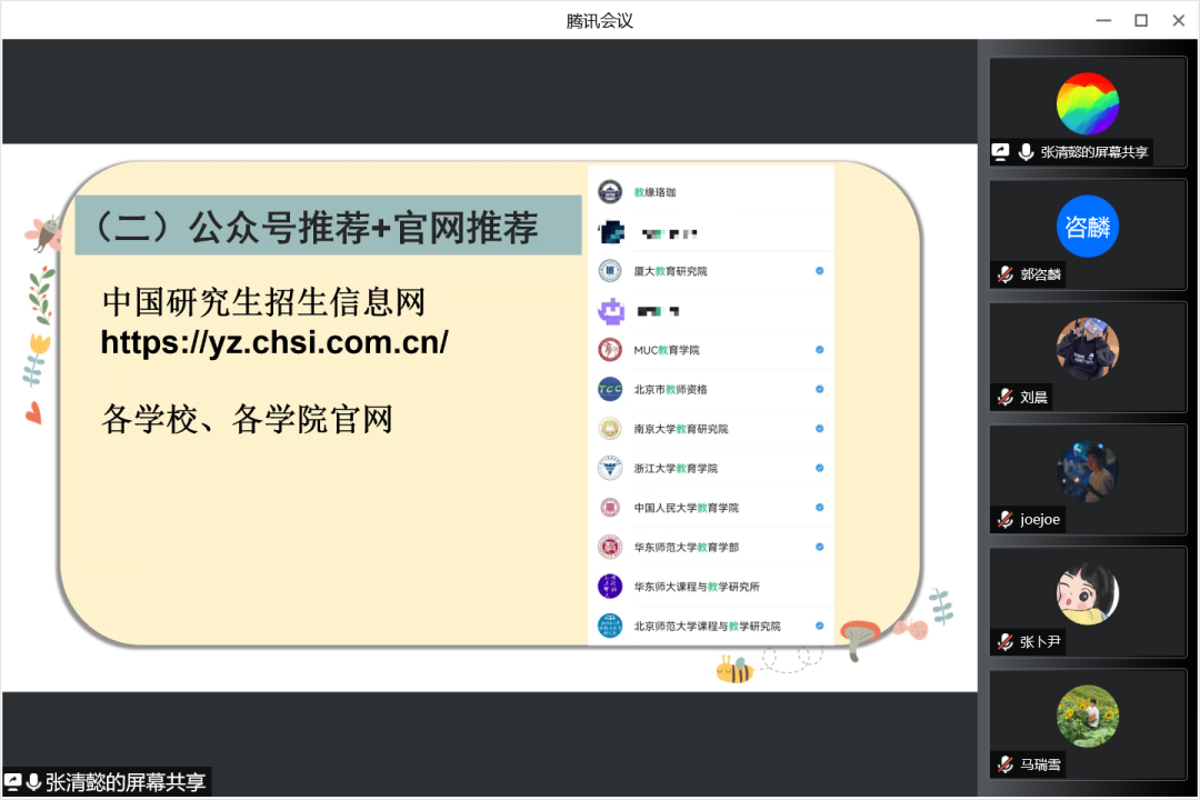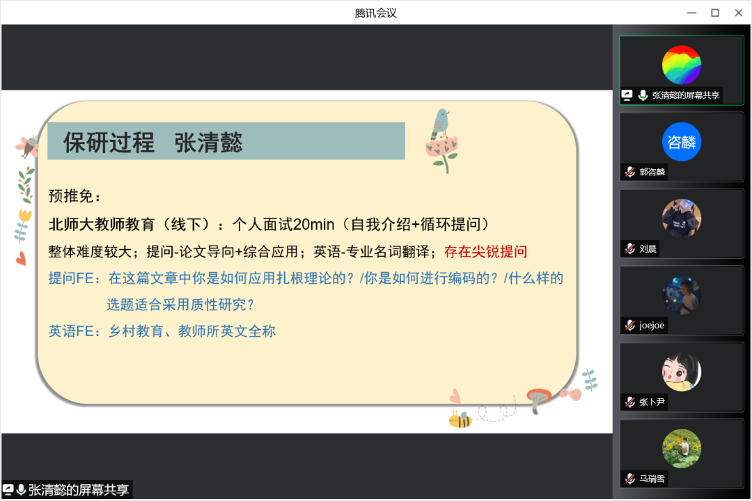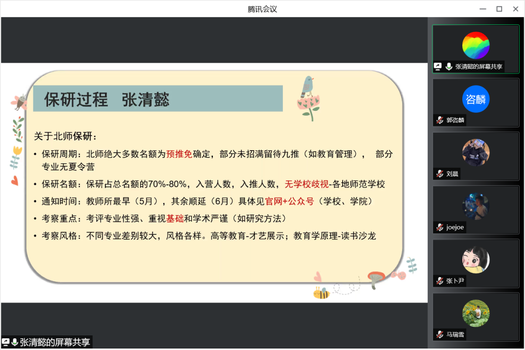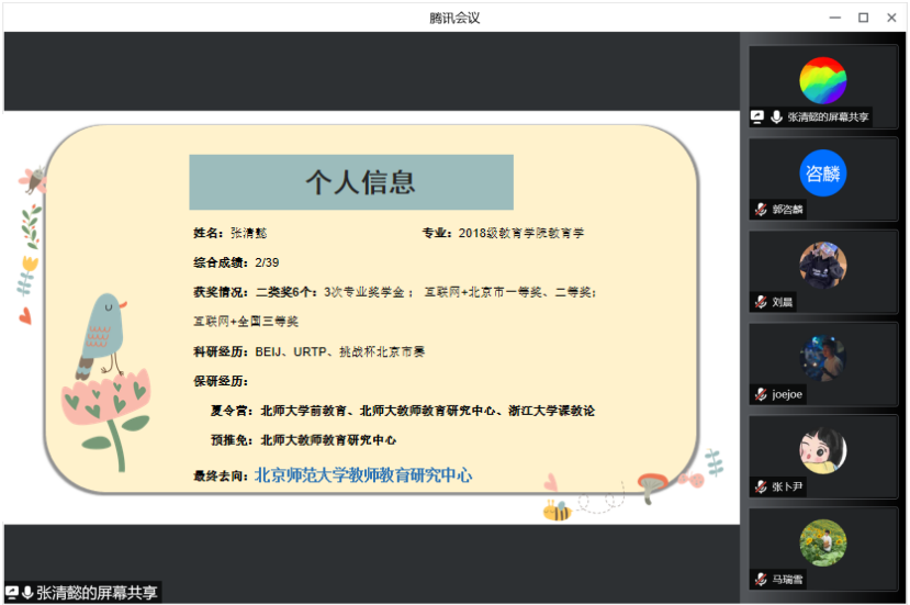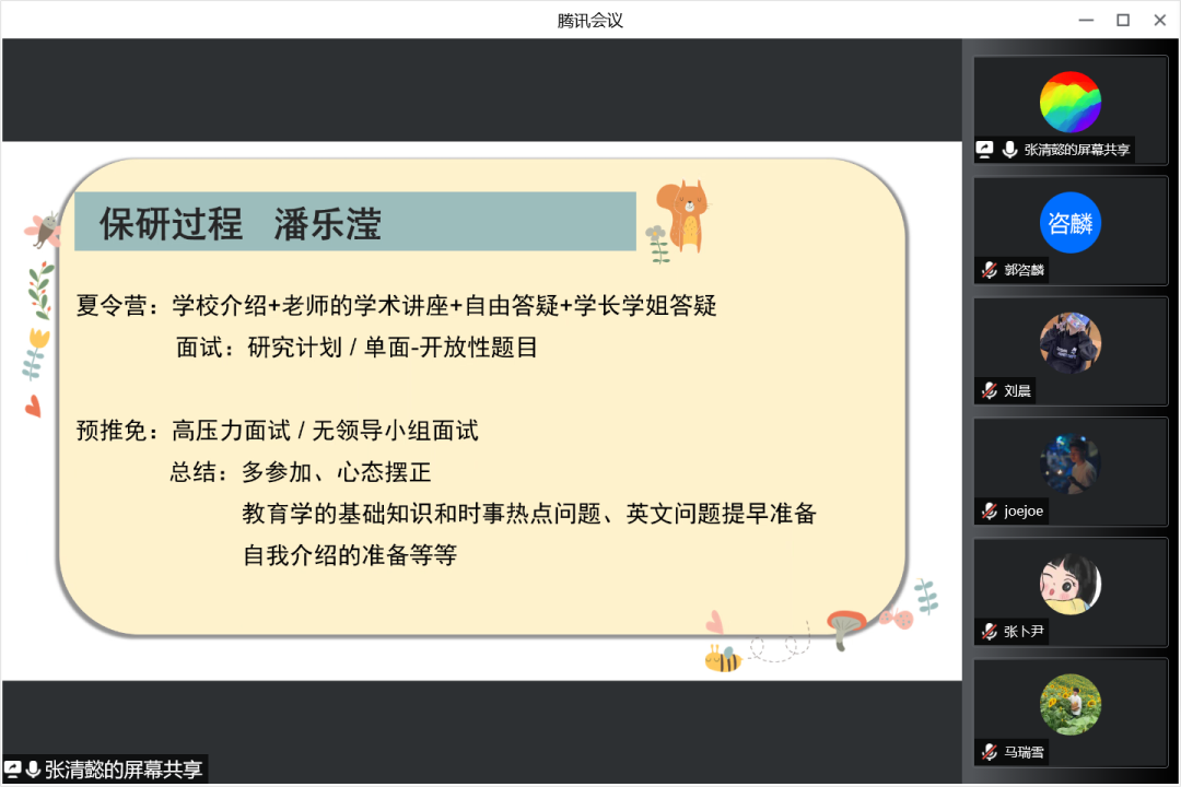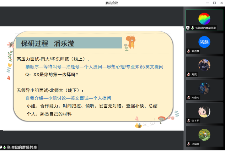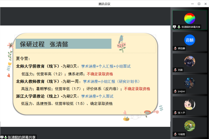 三位嘉宾向参会的同学们介绍了自己的保研过程,并总结了自身在保研过程中遇到的问题以及各个院校在夏令营、预推免环节的特点。吴诗芬介绍了武汉大学、南京师范大学两所公司夏令营的形式和考核方式。潘乐滢在介绍夏令营、预推免过程形式的同时也总结提出了自己在参与预推免过程中的三点经验。第一是要多多参加,摆正心态;第二是要熟知教育学的基础知识和时事热点问题,提早准备英文问题;第三是要准备自我介绍。最后,张清懿从保研周期、保研名额、通知时间、考察重点及考察风格方面详细地介绍了关于北京师范大学的保研事项。希望同学们能够在她们的讲授中总结经验、吸取教训。