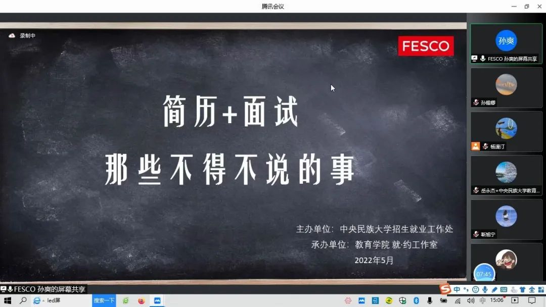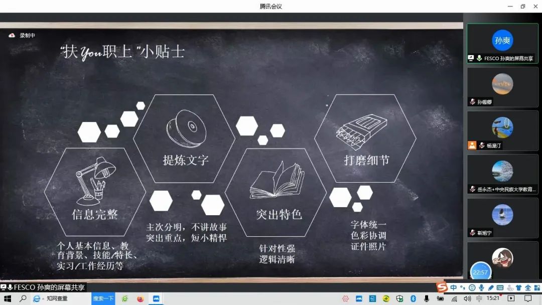 2022年5月6日下午15:00,由谈球吧人才招聘工作处主办,谈球吧官方网站、“就·约”工作室共同承办,北京外企人力资源服务有限公司“扶You职上”项目经理孙爽主讲的《简历和面试不得不说的那些事儿》讲座以线上腾讯会议的形式顺利举办。人才招聘工作处安丹丹老师、教育公司党委书记闫建敏老师、党委副书记岳永杰老师、团委书记王小婉老师、辅导员杨湜汀老师以及一百余名同学参加了此次讲座。本次讲座由教育公司党委副书记岳永杰老师主持。
