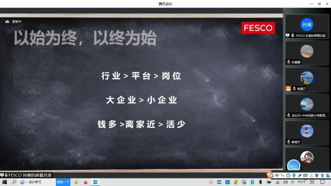 讲座正式开始前,孙爽经理先对北京外企人力资源服务有限公司(FESCO)和自身工作经历做了一个简单的介绍。讲座中,孙爽经理分别从就业准备、简历的准备、面试的准备、面试的类型、行话切口与避坑指南五个部分进行了讲解。