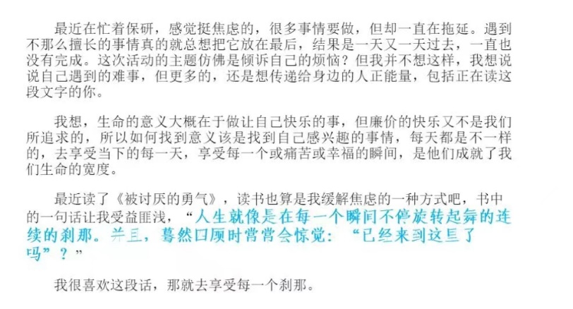 很开心通过这个活动和原来没有交集的同一个公司的陌生人有了联系!我把自己的小快乐和一些烦恼分享出去,也受到了其他同学的小确幸的感染,积极地去发现更多生活中的美好。作为一个高年级的学姐也可以给学弟学妹一些经验和见解,希望他们不会再踩我踩过的坑。很开心能吐露一些心声,也因为能帮到学弟学妹感觉到自己的价值。也许之后我们不会常联系,但是我们曾经是交换过烦恼的有缘人~