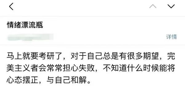 情绪漂流瓶办的还是很好的,给我们提供了一个可以思考交流的空间,为了完成任务,我思考了很多有关自我情绪的东西,也思考了自己最近的生活情绪等状态,最重要的是能和陌生人交流,听听不同人的想法。
