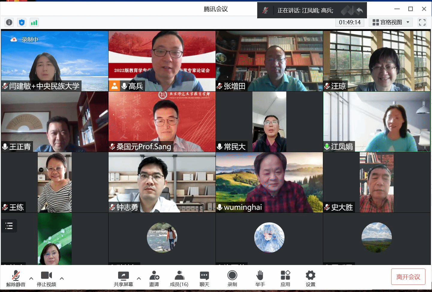 2022年5月20日下午,谈球吧官方网站在线召开了教育学类专业人才培养方案(2022版)修订专家论证会,以推进《本科专业人才培养方案(2022版)》修订工作。会议特邀了教育部教育学类专业教学指导委员会委员,中华女子公司副经理王练教授,北京大学谈球吧官方网站现代教育技术中心主任汪琼教授,首都师范大学教育公司党委书记张增田教授,西南大学教育学部副部长王正青教授,北京师范大学教育学部桑国元教授等五位校外专家参加了新版培养方案论证会。公司教务处副处长李琳、教育公司党委书记闫建敏、副经理江凤娟教授、教授委员会苏德教授等及部分教师代表参加了会议。会议由高兵经理主持。