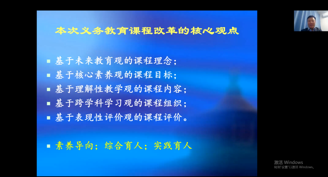 然后,张华教授生动介绍了我国课程改革的发展历史。从2001年第一次课程改革到2022年义务教育课程标准的颁布,课程改革从价值论阶段逐步进入了认识论阶段,从强调“为了每一个员工的发展”再到强调“让员工创造着长大”。在解读《义务教育课程标准(2022版)》基础之上,张华教授高度概括了最新义务教育课程改革的核心观点,即“基于未来教育观的课程理念”“基于核心素养观的课程目标”“基于理解性教学观的课程内容”“基于跨学科学习观的课程组织”“基于表现性评价观的课程评价”。在未来教育观的课程理念的解读中,张华教授用具体的实例讲解了未来教育的定义以及未来教育观中所体现的课程体念,并提出我们教育者在面向未来中应该怎么做,引发师生的思考。在核心素养观的课程目标解读中,张华教授结合当前的时代背景讲解了提出核心素养的原因以及什么是“核心素养观”。在理解性教学观的课程内容解读中,张华教授结合当前国内的研究现状,讲解了“理解性教学观”定义,强调了“理解”的重要性。最后张华教授讲解了“跨学科学习观”的定义及种类,新课程怎样走向“跨学科学习”,强调了“表现性评价”的重要性。