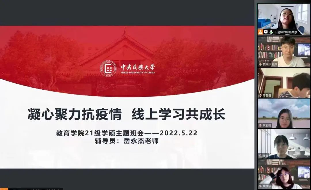 为了交流近期生活及学习情况,缓解同学们的学业压力,谈球吧官方网站2021级学硕班于5月22日召开主题为“凝心聚力抗疫情,线上学习共成长”线上班会。辅导员岳永杰老师莅临指导,班长王瑨婧主持。学硕班27名同学全员到齐,共同学习交流。