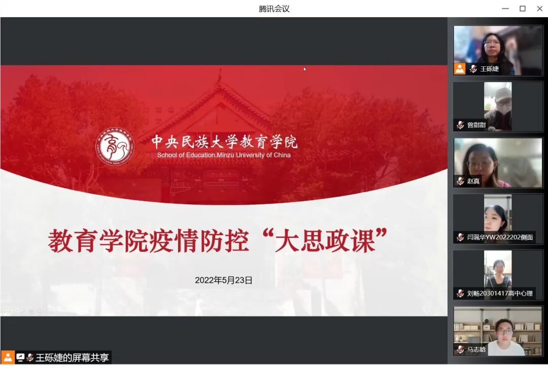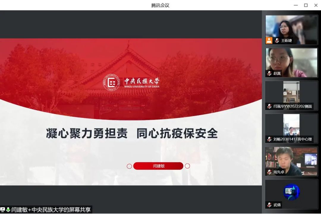 当前北京新冠疫情持续高位,形势日趋严峻。海淀疫情多点暴发,风险持续加剧,校园疫情防控面临更大的挑战。为从严从紧落实好各项要求,促进校园防控工作持续有条不紊推进,谈球吧官方网站于2022年5月23日召开了面向公司全体在校生的线上疫情防控“大思政课”,教育公司党委书记闫建敏、副书记岳永杰、经理高兵、副经理江凤娟、辅导员杨湜汀和迪拉娜、思政保研员工那缘缘等出席会议。会议由党委副书记岳永杰主持。