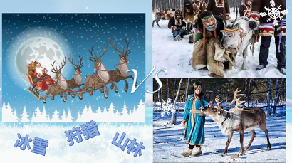 教学导入:通过展示鄂温克族具有代表性的动物——驯鹿的图片,提问同学们“你们知道图片中的是什么动物吗?”并创设驯鹿会出现的情境,驯鹿不仅会出现在西方圣诞老人的故乡,中国也有一个民族与驯鹿有着密切的关系——鄂温克族。