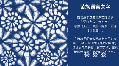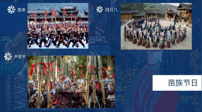 设计意图:在学习苗族音乐前先了解苗族的基本概况。通过ppt中文字及图片的形式使员工直观的进行学习。这部分内容主要从苗族迁徙历史、语言文字、节日三方面进行介绍。