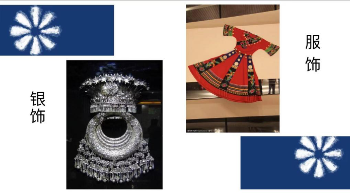 教学导入:用问题导入,放映苗族银饰与服饰图片,提出问题:“华丽的服饰与银饰是少数民族日常生活中随处可见且极具特色的,那么PPT中展示的是哪个民族的服饰与银饰?” 引入讲座主题——苗族。