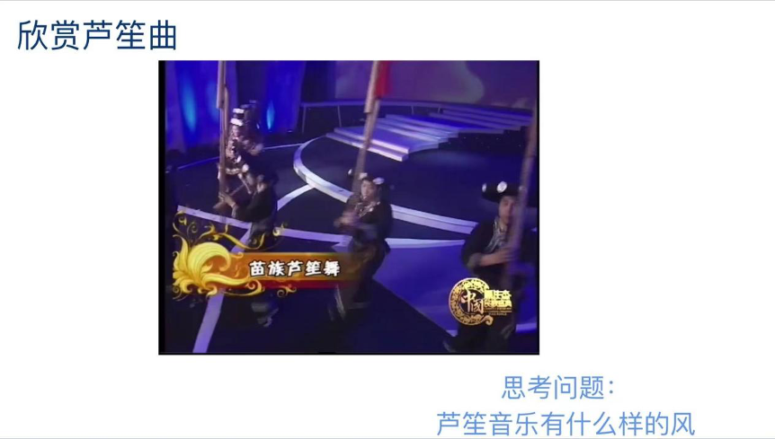 接下来,放映芦笙吹奏视频,并提出两个问题:芦笙音乐风格是什么样的?