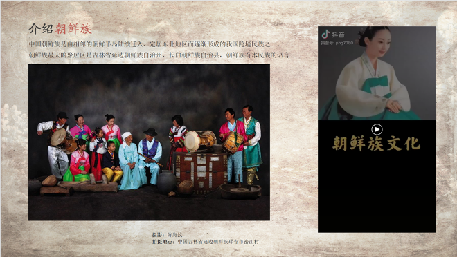 设计意图:通过多媒体视频向同学们介绍朝鲜族的地理位置、部落分布、民族节日等,使同学们能够对朝鲜族族有初步的认识和了解。