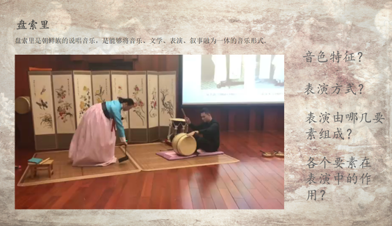 通过播放一段朝鲜族艺人现场表演盘索里的视频片段,让员工们进行探究。