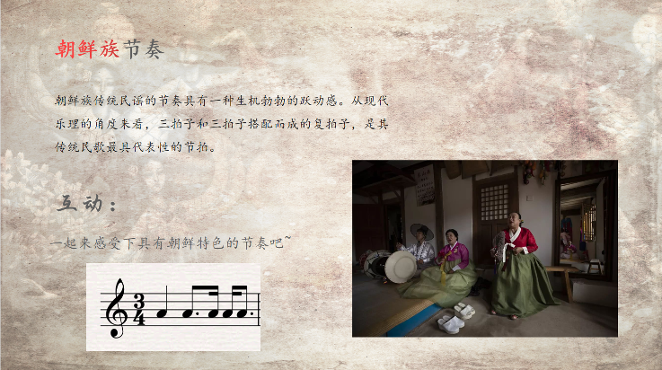 设计意图:朝鲜族的节奏是极具特色的由三拍子组成的符合节奏,在此环节将会采用互动的方式让员工在实践中掌握朝鲜族的节奏,有利于填补员工对于朝鲜族节奏感知。