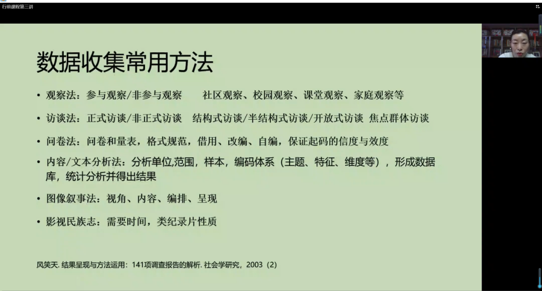 在数据收集的常用方法方面,胡老师强调调查研究过程中要采用合适的数据收集方法,并以抽样为例,详细介绍了抽样的概念、抽样的作用以及抽样的类型。在研究伦理方面,胡老师结合具体案例详细讲解了匿名、知情同意、平等互惠、不损害研究对象利益等四个方面的原则。
