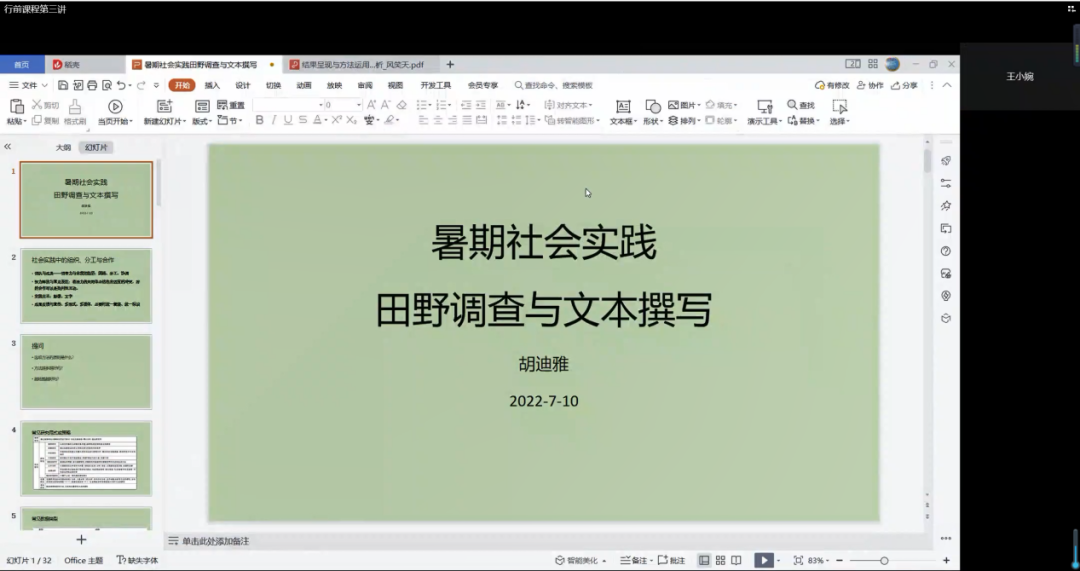 会议最后,王小婉老师对本次会议做了总结。王小婉老师对于胡迪雅老师精心的准备和深入细致的讲解表示感谢,鼓励同学们学以致用,以专业严谨的态度开展本次暑期社会实践。