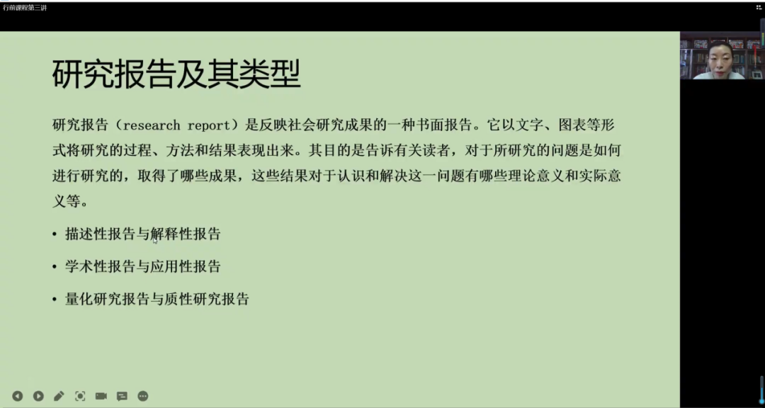 接下来,胡迪雅老师对研究报告及其类型展开了详细讲解。胡老师指出题目、摘要、关键词都是研究报告的“门面”,强调了学术规范性的重要及撰写研究报告需要注意的事项。
