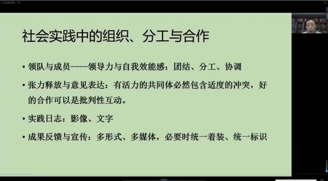 会议开始,胡迪雅老师就社会实践中的组织、分工与合作展开详细讲解,介绍了常见的研究范式或策略以及常见的数据类型,并指出调查研究要使思辨研究和实证研究相结合,调查数据要详实多样。
