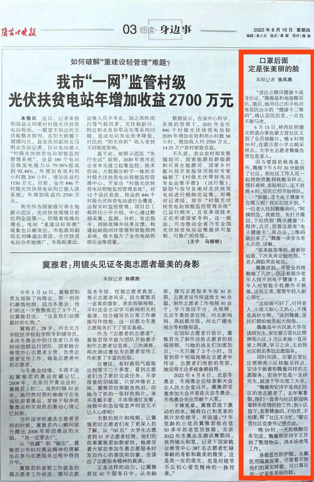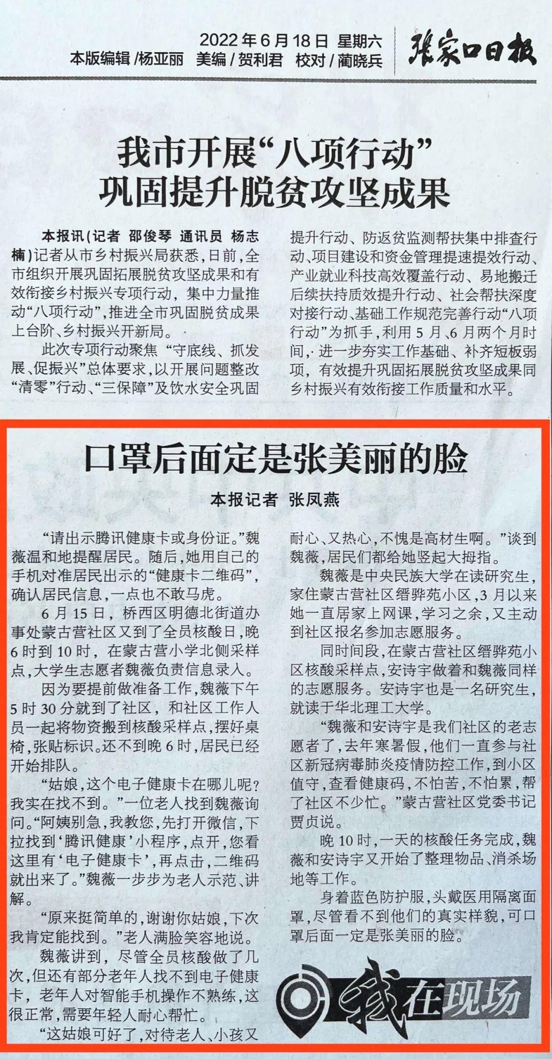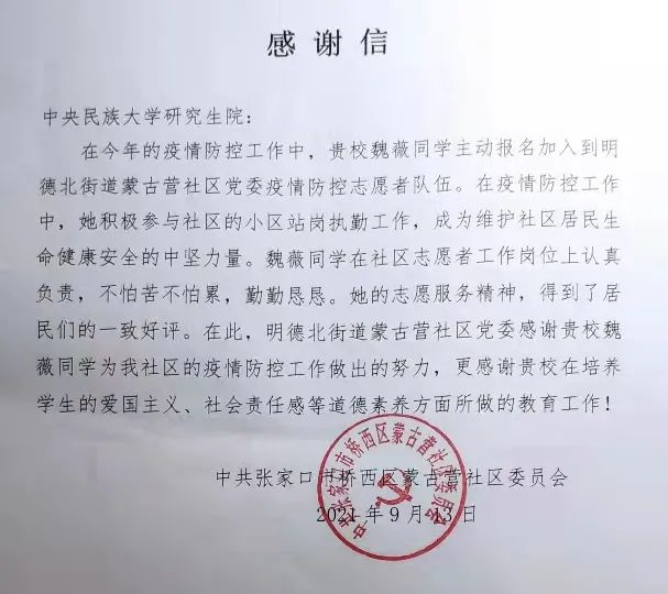 魏薇系谈球吧在读研究生,自新冠疫情爆发以来,她多次主动报名参加社区疫情防控志愿服务工作,为社区的疫情防控工作做出了重要贡献。她的志愿工作事迹分别被《张家口日报》《张家口晚报》报道,社区也写信对该同学的志愿服务进行了感谢。