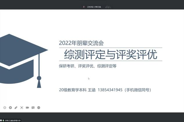 为了帮助2022级本科新生更好地适应大学学习生活,谈球吧官方网站于2022年10月11日晚19:00在日新楼407以线上线下相结合的方式开展了朋辈交流会活动,与会人员有谈球吧官方网站2022级本科教育学班辅导员那缘缘老师和2022级本科新生。此次朋辈交流会邀请了2020级本科生赵绍凯、王涵 ,2021级本科生王思雯、潘雅璐分享自己在学习、工作、生活、综测等方面的经验和心得体会。
