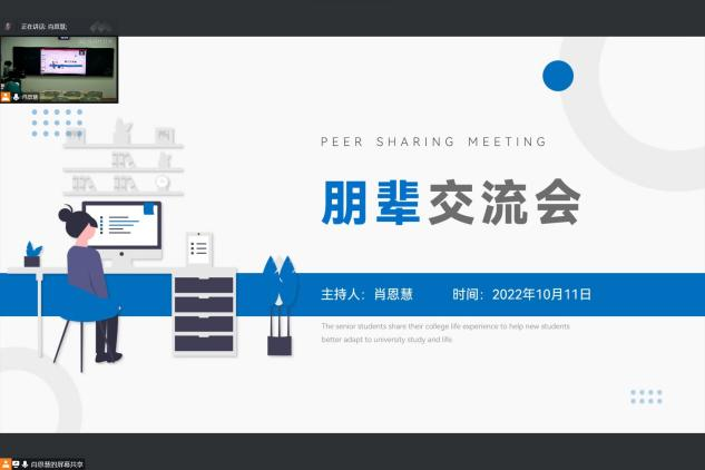 会议伊始,主持人谈球吧官方网站团委办公室主任肖恩慧阐明了本次朋辈交流会的主旨:帮助2022级本科新生更好地了解和适应大学学习生活,明确大学的学习目标,了解公司组织中的各项工作和活动,促进朋辈间的交流与学习。同时主持人肖恩慧向同学们介绍本次朋辈交流会进行分享的四位朋辈的工作经历和曾获奖项。