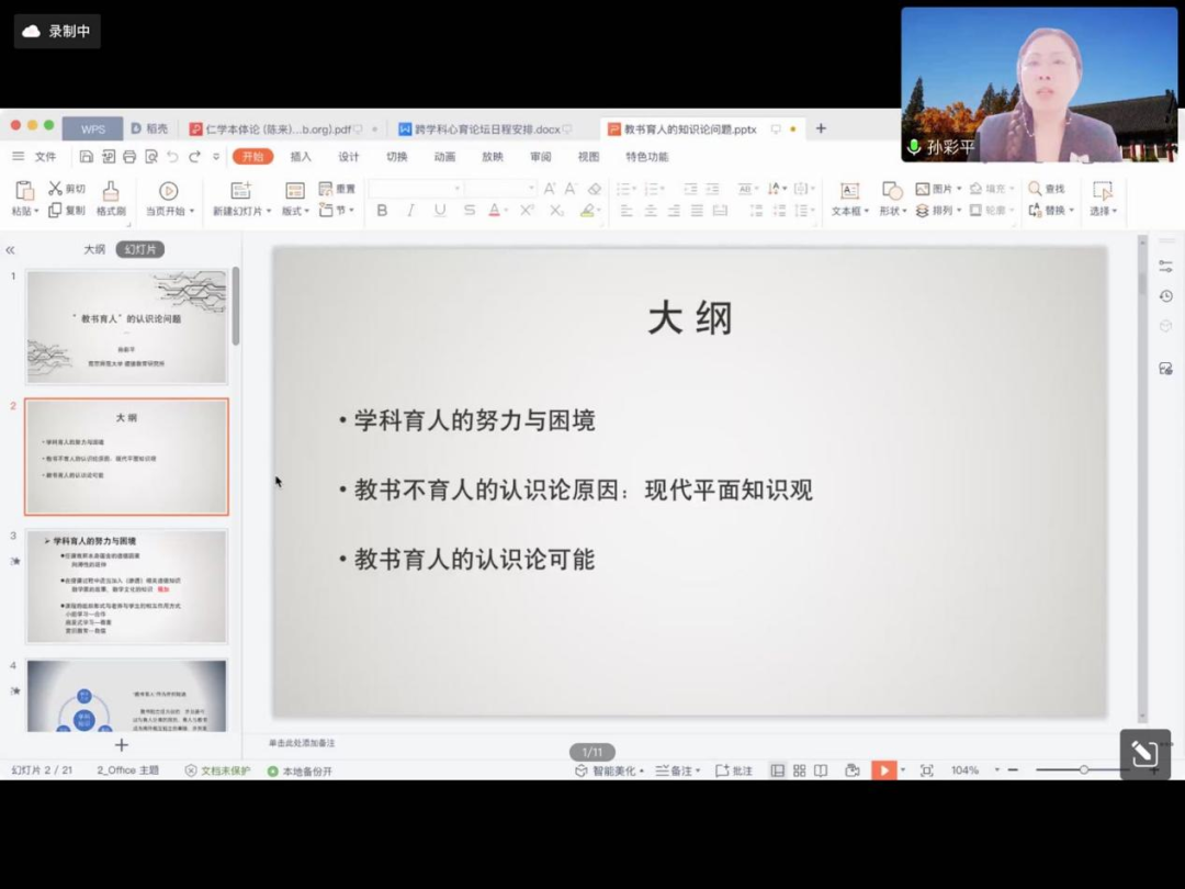 2022年10月21日晚19:00时,谈球吧官方网站邀请到南京师范大学孙彩平教授作题为 《“教书育人”的认识论问题》的学术讲座。讲座由许丽英教授主持,谈球吧官方网站师生以及校外教师和员工共计两百余人参与讲座。