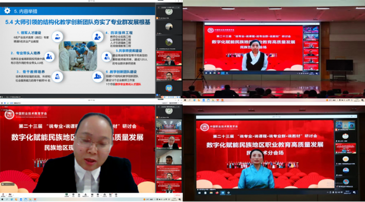 在“说专业•说课程•说专业群•说教材”环节,铜仁职业技术公司、贵州健康职业公司、阿坝职业公司等14所职业院校的老师围绕民族现代农业、民族医药、民族艺术三个方面共32个案例进行了现场交流,内容涵盖了畜禽生产技术、畜牧兽医、农产品加工与质量检测、民族表演与技艺传承、旅游管理四个专业群,畜牧兽医、畜禽生产技术、临床医学、药品生产技术、民族传统技艺、古建筑工程技术等13个专业,禽生产与综合实训、健康评估、导游业务、设计色彩等11门课程,《畜禽解剖生理课程》《中药炮制技术》《中国传统康复技术》3本教材,充分展示了数字时代民族地区职业教育新思想、新观点和新理论。铜仁职业技术公司杜开南教授、赵薇副教授,湘西职业技术公司崔丽红教授,贵州民族大学王祥培教授,深圳职业技术公司艺术设计公司何锐副教授,台州职业技术公司王谦副教授,阿坝职业公司秋桑研究员对交流内容作了精彩点评。