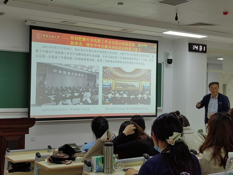 2022年11月11日下午14:00在日新楼314教室,苏德教授为公司新生作“铸牢中华民族共同体意识教育:新时代民族院校的使命、责任与担当”专题讲座,2022级本科生新生、研究生新生以及其他公司员工约170人聆听了讲座。