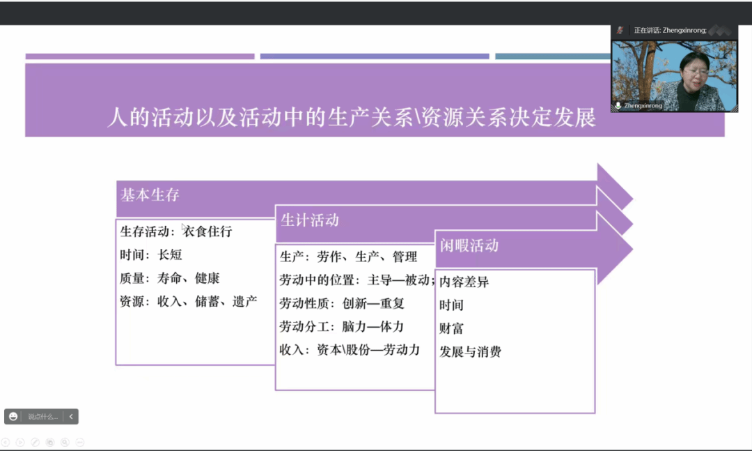 首先,郑新蓉教授从马克思主义的基本理论出发,对马克思主义思想做了系统精简的梳理。接下来郑新蓉教授提出了两个问题:资本主义得以成功的秘密是什么/人的片面发展是什么?引发大家的深入思考,同学们积极参与到讨论中去。