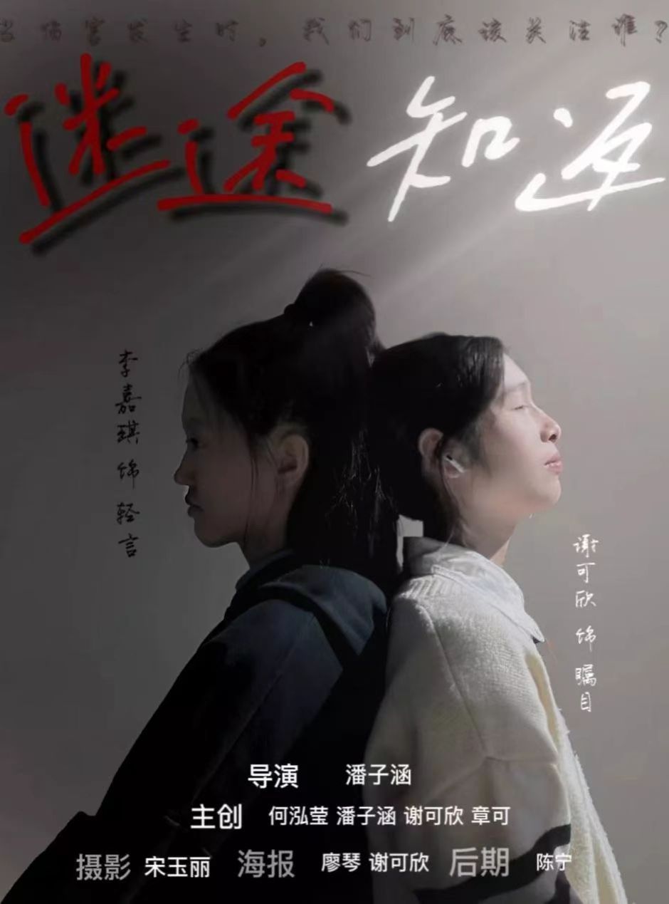 第二部展播的微电影是《迷途知返》,本片以主人公——乐观者“瞩目”的视角,讲述在初入大学时学业、社团、生活多重压力下,她最好的朋友“轻言”走向迷途,两人关系经历了从破裂到修复的故事。影片中“瞩目”通过自省与求助救赎了“轻言”,让“轻言”迷途知返。本片多采用倒叙、穿插回忆的展示方式,引人入胜,呼吁我们应该全面深入地看问题,少一些偏差,给隐形的受害者更多关注与理解。