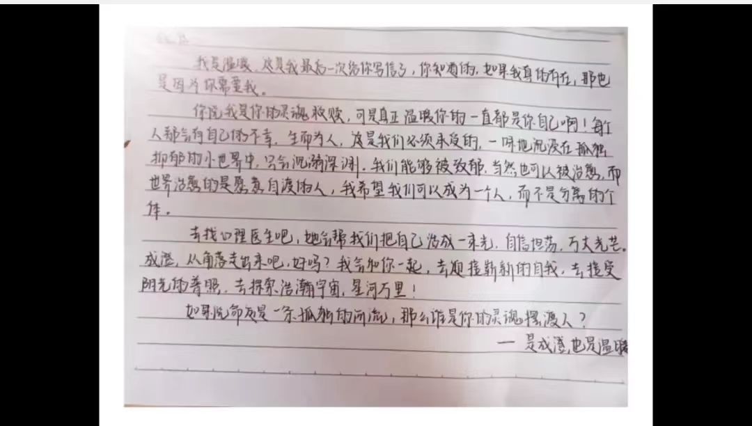 第八部展播的微电影是《渡我》,本片通过对主人公日常生活以及信件来往的刻画,展现了人格分裂患者在负重前行的道路中自我救赎的故事。成澄和温暖同根同源,既可以是黑暗,也可以是光明。谨以此片献给广大同学,希望大家在面对学习、生活上的困难时,不要放弃。请铭记:无论何时我们都是自己最大的底气和依靠。