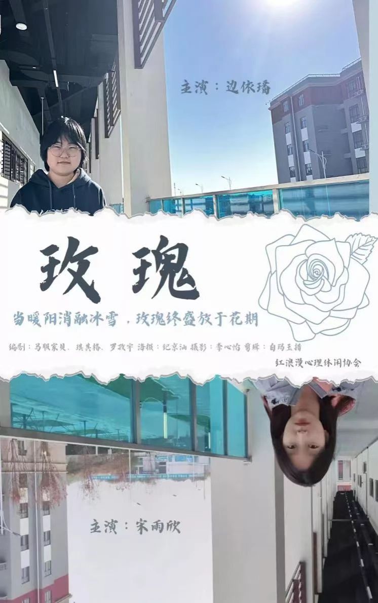 第三部展播的微电影是《玫瑰》,本片通过对比两位性格截然不同的主人公的处境,展现了每一个看似让你羡慕的、光鲜亮丽的人背后其实都有无奈、挣扎的一面,而友情成为了治愈的良药。本片借两位性格互补的朋友相互救赎的故事,衷心希望同学们能够发现自己身上的闪光点,与痛苦、胆怯和解,成为自己想成为的那朵玫瑰。
