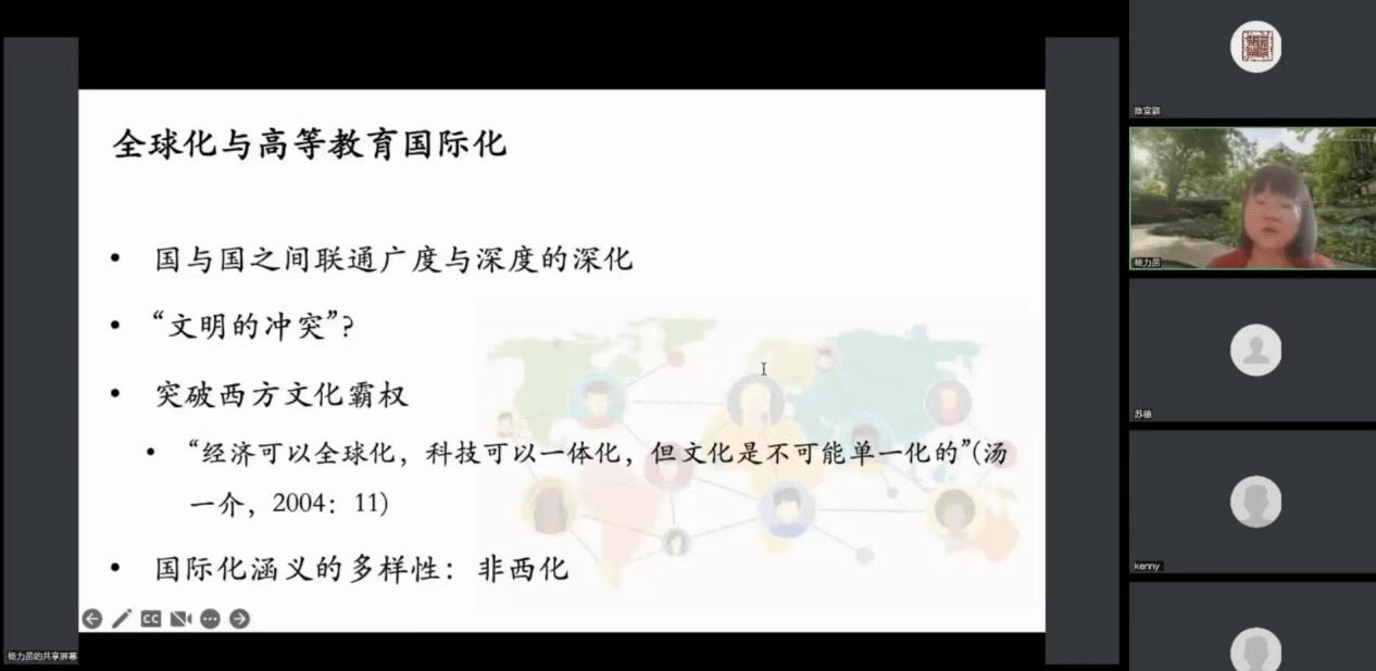 首先,杨力苈教授以中西文化间的互动为切入点,讲解全球化与高等教育国际化的内容,从地理、历史等多个维度帮助同学们理解国际化的内涵。通过讲述包含多元内涵的国际化概念,阐述对西方视角下国际化概念“主流”定义的审思。杨教授立足我国知识传统,以构建融会多元知识体系的高等教育为出发点,对国际化概念进行重构。杨教授强调我国知识与文化传统能够对世界高等教育乃至人类文明发展做出巨大贡献的责任与潜力,开拓了同学们的文化视野。讲座最后,杨力苈教授还与参会的老师和同学们进行互动和交流,同学们纷纷表示在本次讲座中收获颇丰,讲座在师生热烈的掌声中落下帷幕。