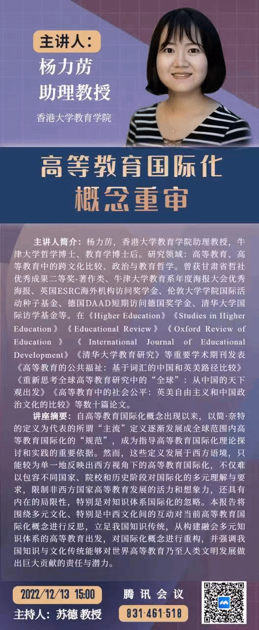 2022年12月13日15:00,谈球吧官方网站邀请到香港大学杨力苈教授为全体师生作题为《高等教育国际化概念重审》的学术讲座。本次讲座由苏德教授主持。