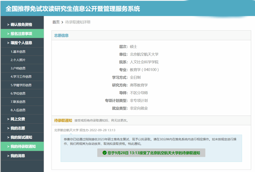 最终,9月28日下午13:13,我接受了北航的待录取通知,至此我的保研之旅也正式结束。