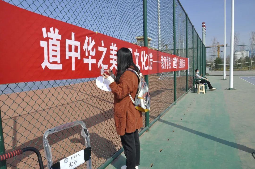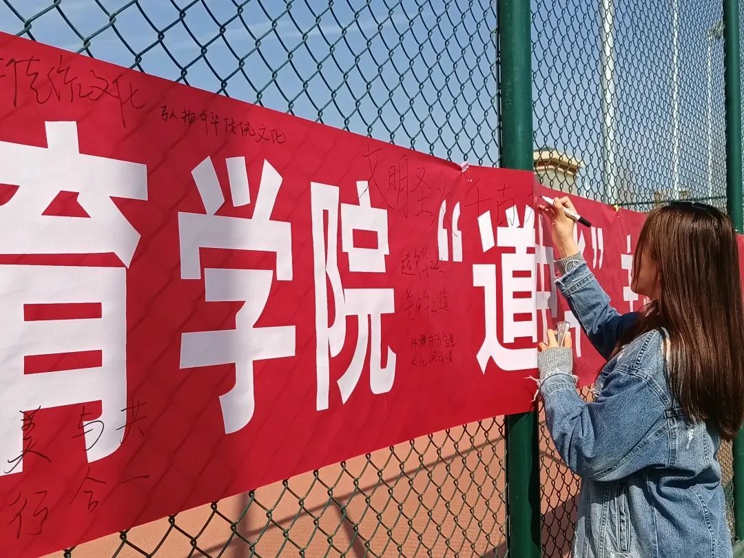此关卡的规则是在条幅上用白板笔写下有关“道中华之美、美中华之道”的宣传口号等相关语句。临近活动尾声,同学们通过一系列有趣的活动,对中华文化产生了很多感想,通过设置这一关卡,鼓励同学们用笔写下自己的感悟与宣言,“美美与共,共道中华”“传承文化、共道中华、你我同行”……一句句口号下是同学们炽热的心跳,是传承传统文化的决心,这一关卡也将成为激励大家增强文化自信、弘扬民族传统美德的重要仪式。