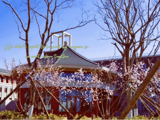 温一壶花香,落满盏春光……蔚蓝的天空下,桃花与教学楼交相辉映,不禁感叹“桃之夭夭,灼灼其华”…